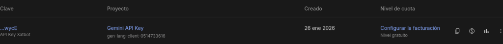Hem generat una API Key dins de Google AI Studio per fer-la servir en la programació del xatbot.