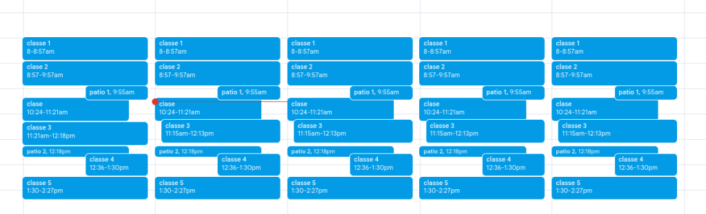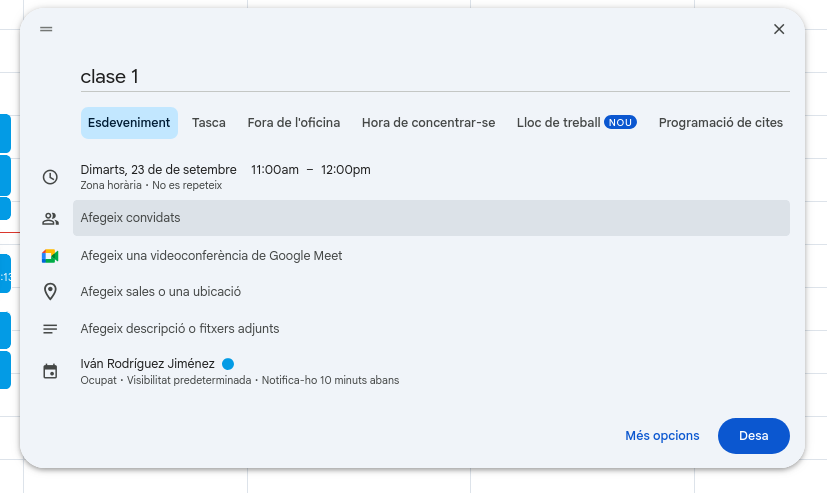Posa el nom de la classe i l'hora a què comença i acaba