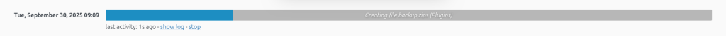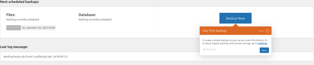 Prem el botó Backup Now. Tens l’opció de seleccionar si vols incloure la base de dades, els fitxers, o tots dos en la còpia de seguretat. Un cop escollit, torna a prémer Backup Now per iniciar el procés.