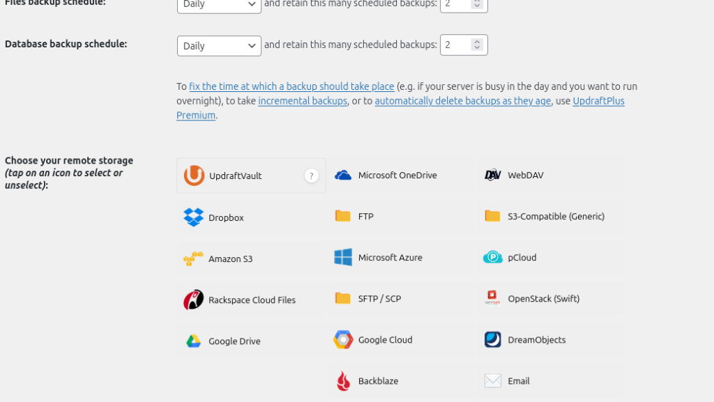 Des d’aquí podràs definir la freqüència amb què es faran les còpies de seguretat de la base de dades i dels fitxers (diària, setmanal, mensual, etc.). També pots indicar quantes còpies vols conservar al mateix temps (per exemple, les 2 més recents).