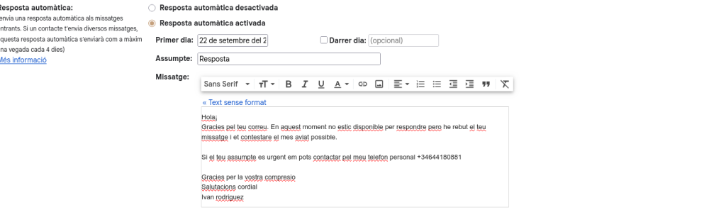 En l’apartat general, he baixat fins arribar a l’opció de “Resposta automatica”.